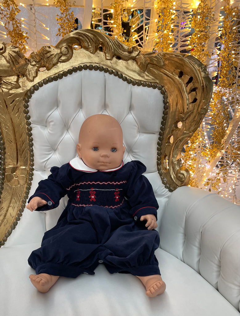 Avec ses manches longues, son col claudine avec un billet rouge et toujours ce buste smocké et brodé à la main, la barboteuse Maki Rose est idéale pour vos tout petits. Ici, le modèle est en tissu uni couleur bleu marine avec des broderies de petit ourson ou de bonhomme de neige , pour un hiver chic.