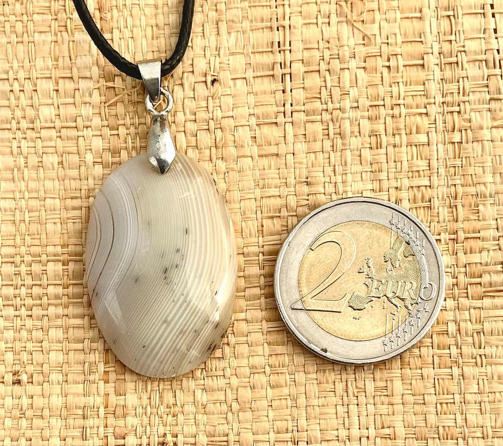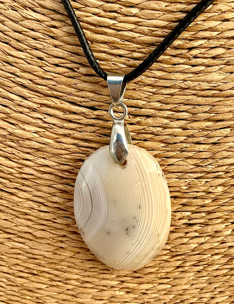 Pendentif en pierre véritable polie, vendu avec un collier en cordon noir remplaçable.