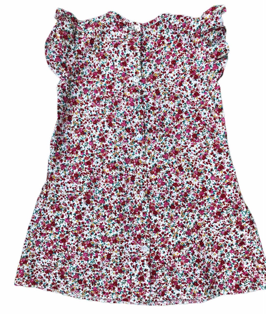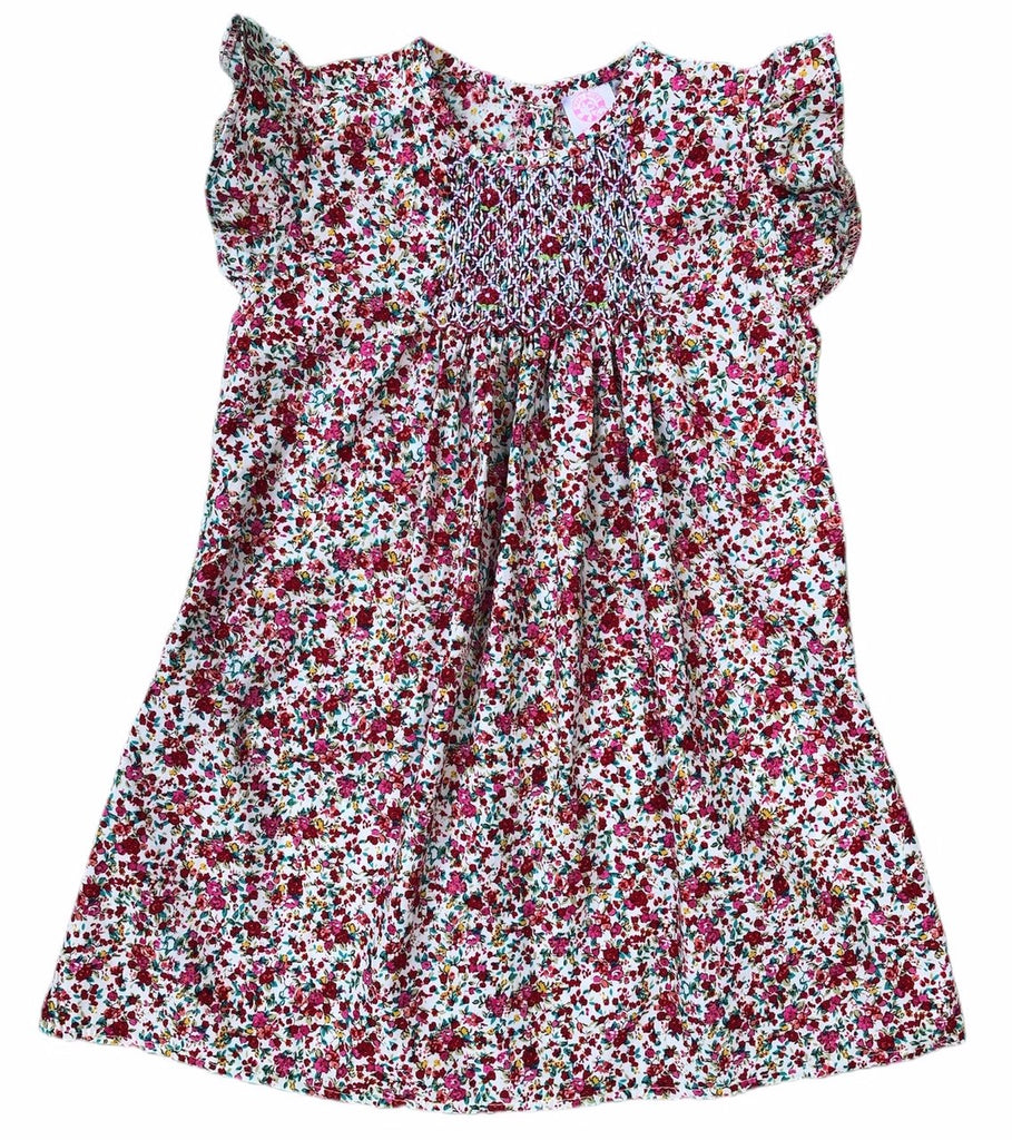 La robe blouse smockée est notre dernière nouveauté, directement inspirée par nos blouses et vos suggestions quant à les décliner en tant que petite robe. Ce modèle arbore un tissu à fleurs à dominante rouge sur fond blanc. Sans manches avec de petits volants aux épaules et un carré smocké et brodé main au niveau du col, cette robe légère tombe au dessus du genou et saura ravir les plus jeunes comme les plus âgées de vos princesses.