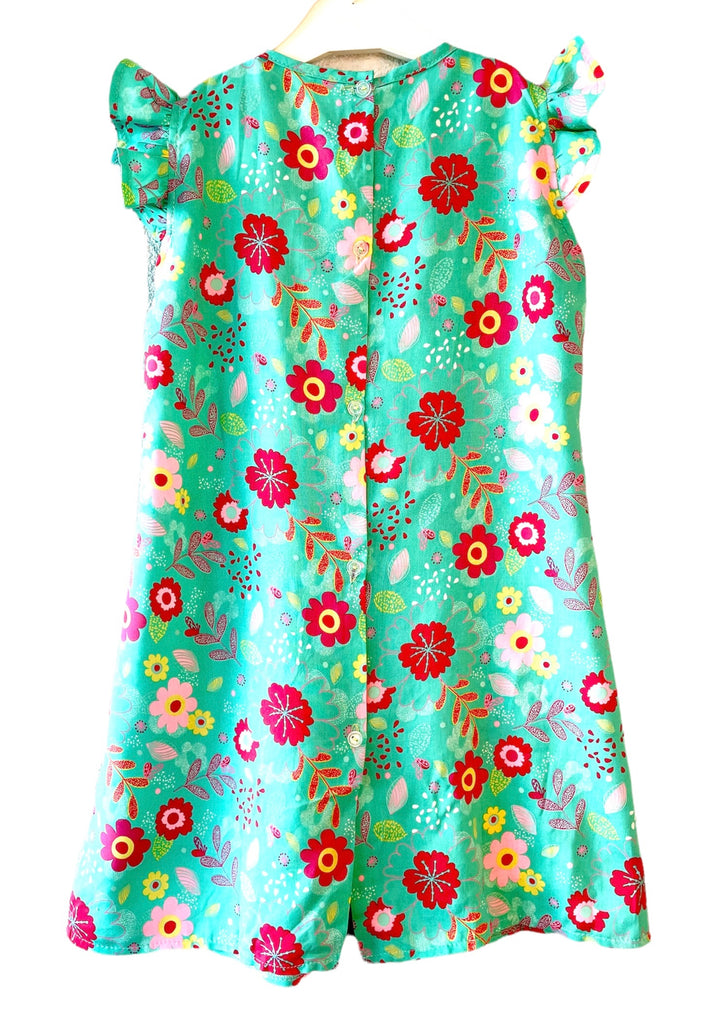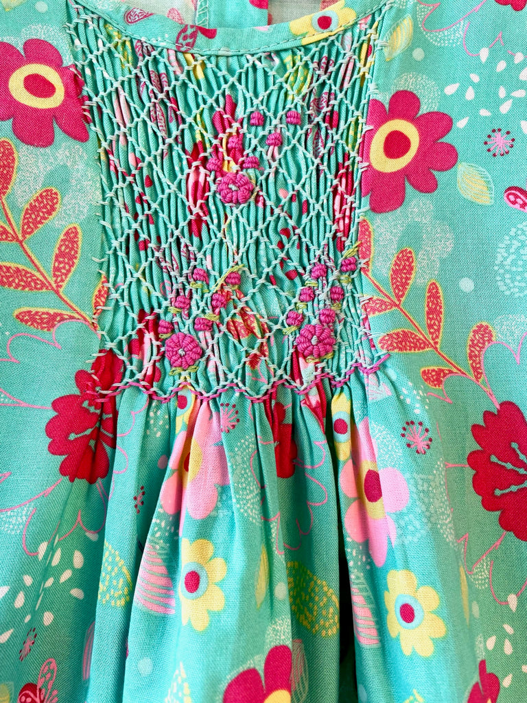 La robe blouse smockée est notre dernière nouveauté, directement inspirée par nos blouses et vos suggestions quant à les décliner en tant que petite robe. Le modèle "Turquoise" arbore un tissu bleu turquoise à fleurs colorées, plein de peps ! Sans manches avec de petits volants aux épaules et un carré smocké et brodé main au niveau du col, cette robe légère tombe au dessus du genou et saura ravir les plus jeunes comme les plus âgées de vos princesses.
