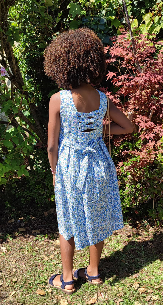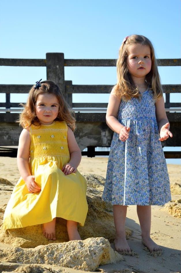 The smocked chasuble dress is an essential. The "Piso" model features a blue, green and white floral fabric. This sleeveless dress has a fully smocked and hand-embroidered bust and a ribbon to tie at the back, it falls just above the knee and gives this effect "princess dress" effect when your kids are spinning.
