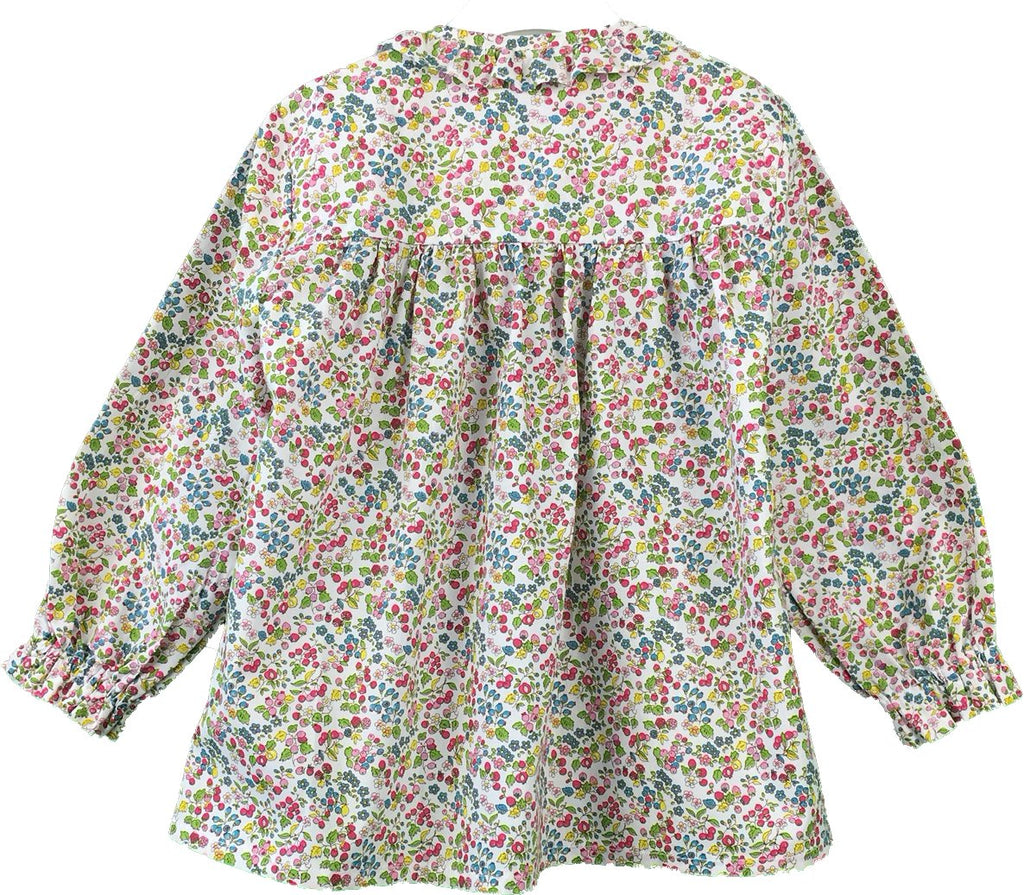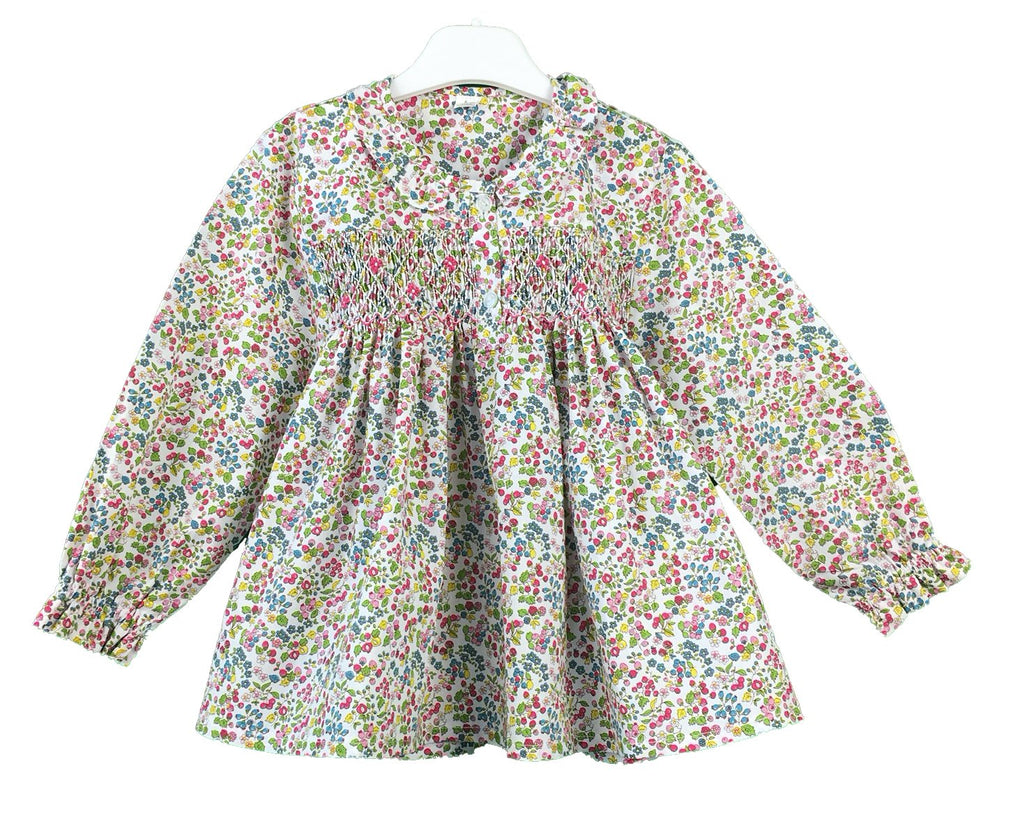 Pour garder une touche smockée sur sa tenue sans pour autant porter de robe, la blouse est parfaite pour remplir ce rôle. Ici, le modèle est blanc à fleurs et fruits multicolores. A manches longues, ornée de volants au col et au bout des manches, une bande smockée et des broderies faites à la main par dessus, une forme évasée et légère : cette pièce saura se marier à la perfection avec de nombreuses tenues dont des jupes, pantalons, bermudas, shorts... Intemporelle et pour toutes les occasions, cette jolie blouse saura ravir les plus petites comme les plus âgées !