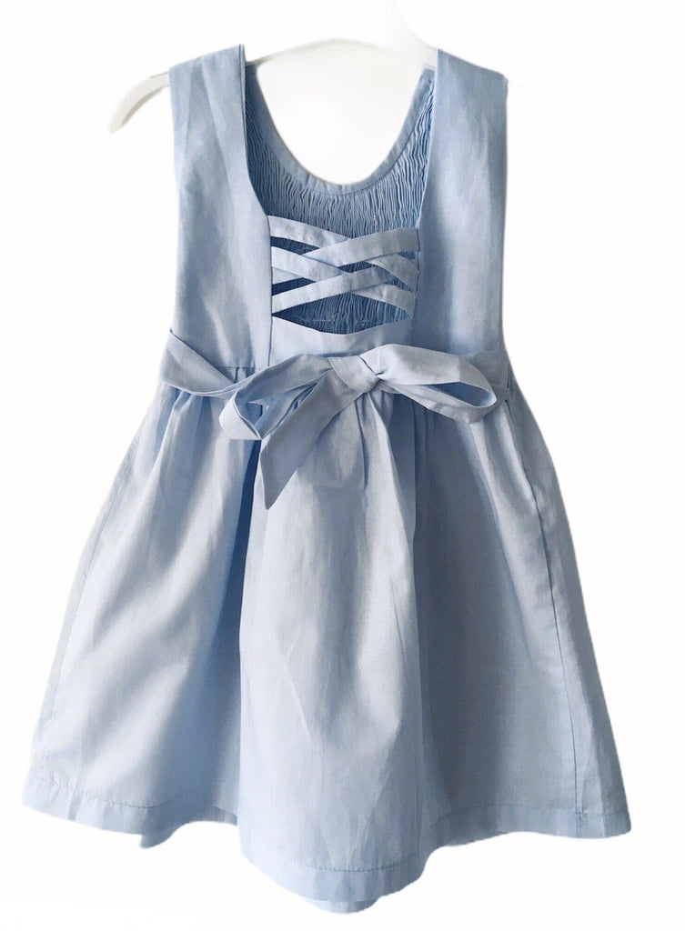 La robe chasuble smockée est un modèle incontournable. Ici, le modèle est de couleur unie bleu clair. Sans manches avec le buste entièrement smocké et des broderies faites à la main, un ruban à attacher à l'arrière pour cintrer le modèle ainsi qu'un joli dos à croisillons ajouré, elle tombe juste au dessus du genou et donne cet effet "robe de princesse" lorsque vos pitchounes tournent sur elles-même.