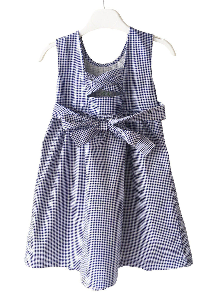 La robe chasuble smockée est un modèle incontournable. Ce modèle arbore un tissu vichy bleu marine et blanc. Sans manches avec le buste entièrement smocké et des broderies faites à la main, un ruban à attacher à l'arrière pour cintrer le modèle ainsi qu'un joli dos ajouré, elle tombe juste au dessus du genou et donne cet effet "robe de princesse" lorsque vos pitchounes tournent sur elles-même.