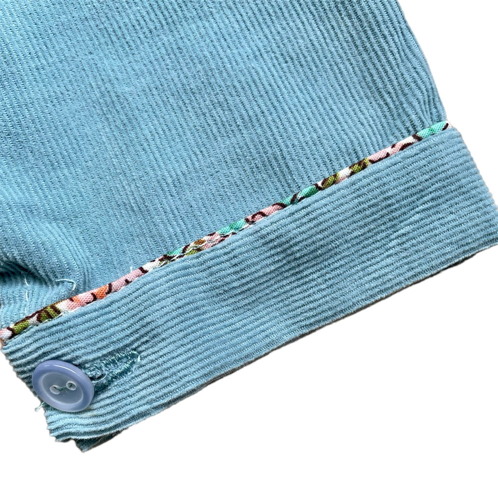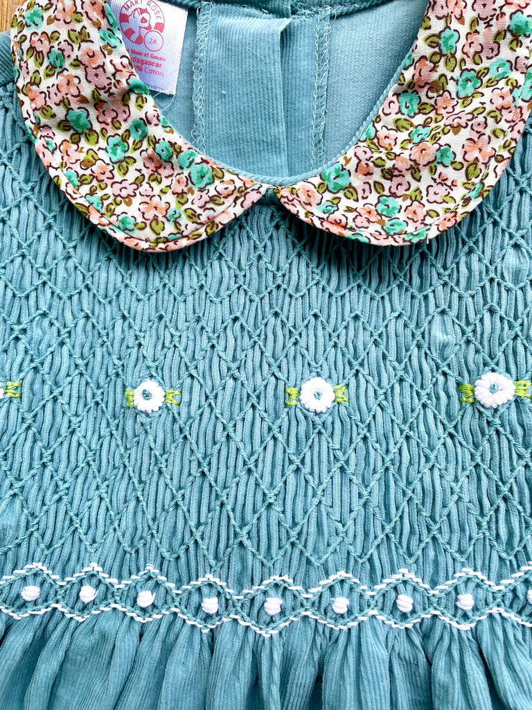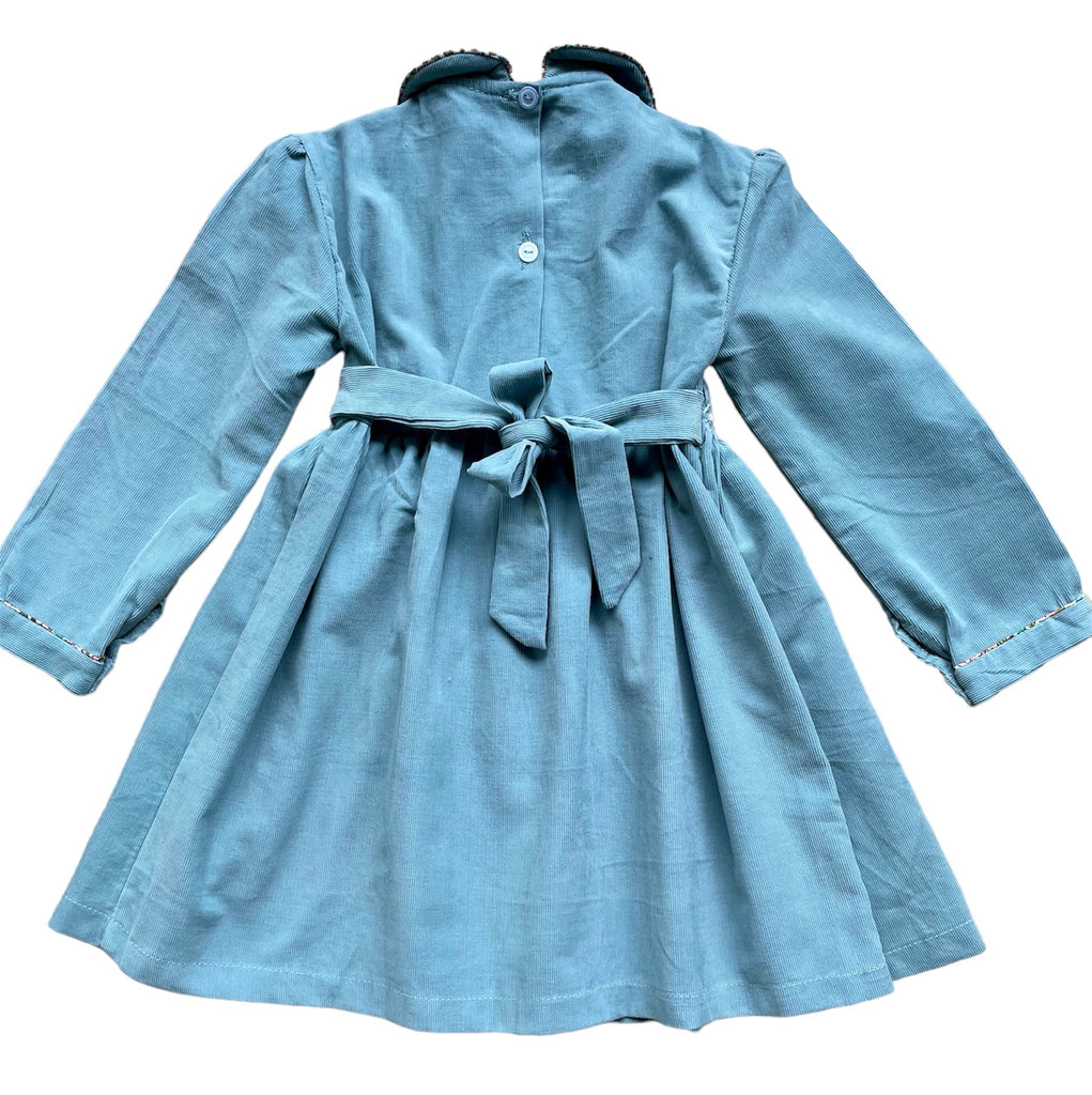Ici, le modèle est en velours uni bleu marine et orné de broderies rouges. Jolies manches longues avec un petit effet bouffant au bout, col claudine blanc, buste entièrement smocké et des broderies faites à la main, un ruban à attacher à l'arrière pour cintrer le modèle ainsi qu'un dos fermé par des boutons nacrés... Ce sont tous ces détails qui lui apportent toute son élégance. Elle tombe juste au niveau du genou et donne cet effet "robe de princesse" lorsque vos pitchounes tournent sur elles-même.
