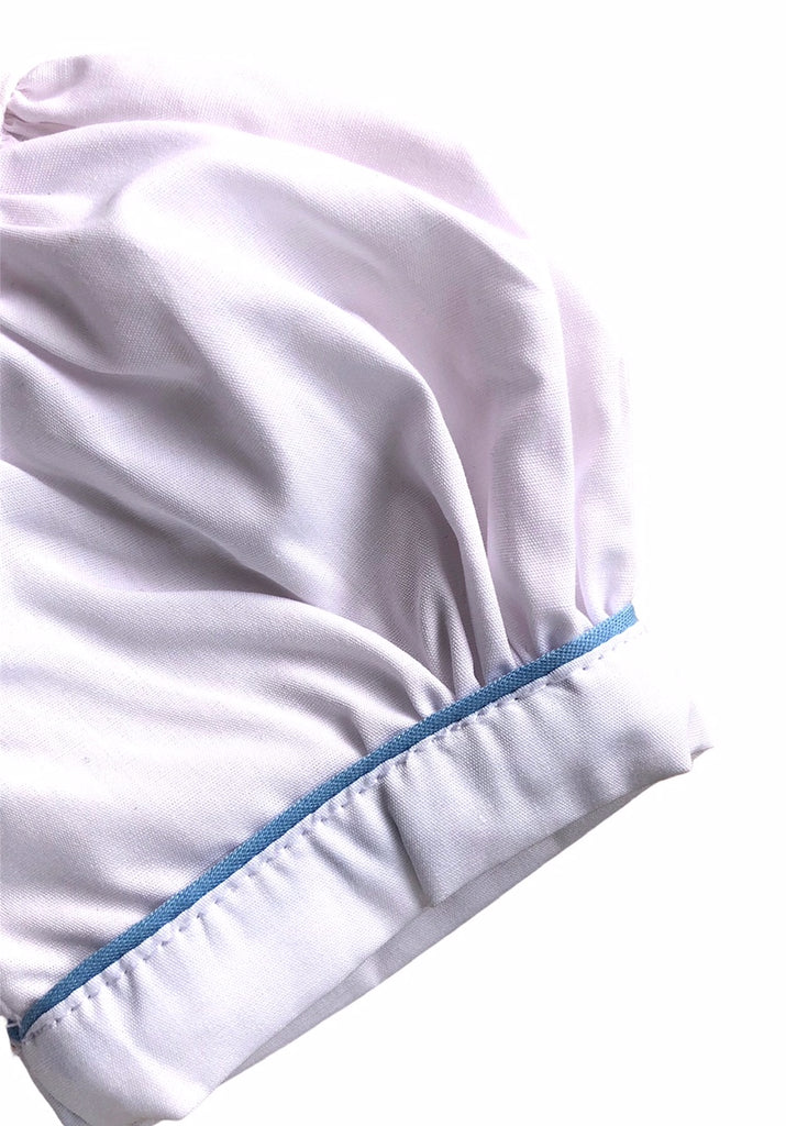 Avec ses manches ballons, son col claudine à liseré et toujours ce buste smocké et brodé à la main, la barboteuse Maki Rose est idéale pour vos tout petits. Ici, le modèle est en tissu uni blanc avec des broderies bleues.