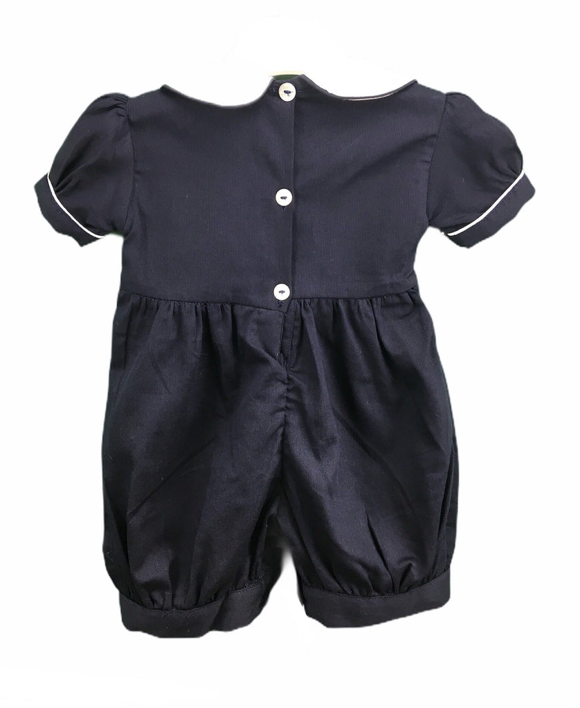 Avec ses manches ballons, son col claudine à liseré et toujours ce buste smocké et brodé à la main, la barboteuse Maki Rose est idéale pour vos tout petits. Ici, le modèle est en tissu uni bleu marine avec de jolies broderies à dominante blanches