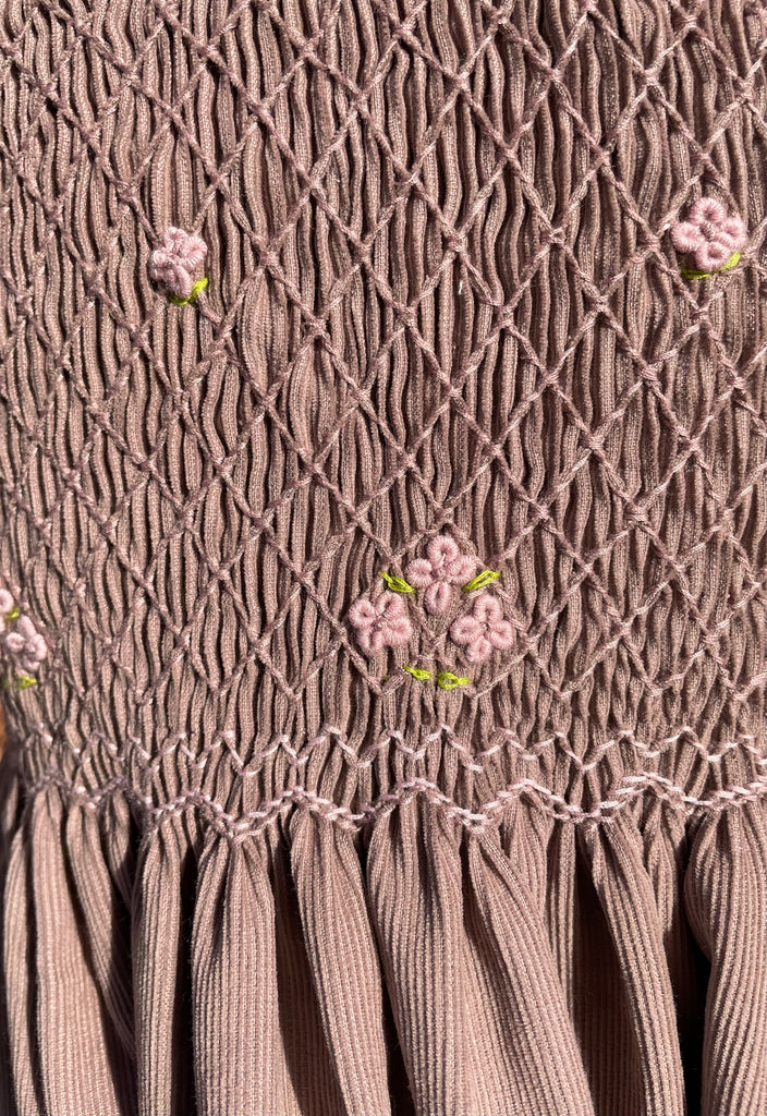 Ici, le modèle est en velours uni d'un mauve rosé se rapprochant du lilas, et orné de broderies roses claires. Jolies manches longues avec un petit effet bouffant au bout, col claudine avec un liseré, buste entièrement smocké et des broderies faites à la main, un ruban à attacher à l'arrière pour cintrer le modèle ainsi qu'un dos fermé par des boutons ... Ce sont tous ces détails qui lui apportent toute son élégance. Elle tombe juste au niveau du genou et donne cet effet "robe de princesse" lorsque vos pitchounes tournent sur elles-même.