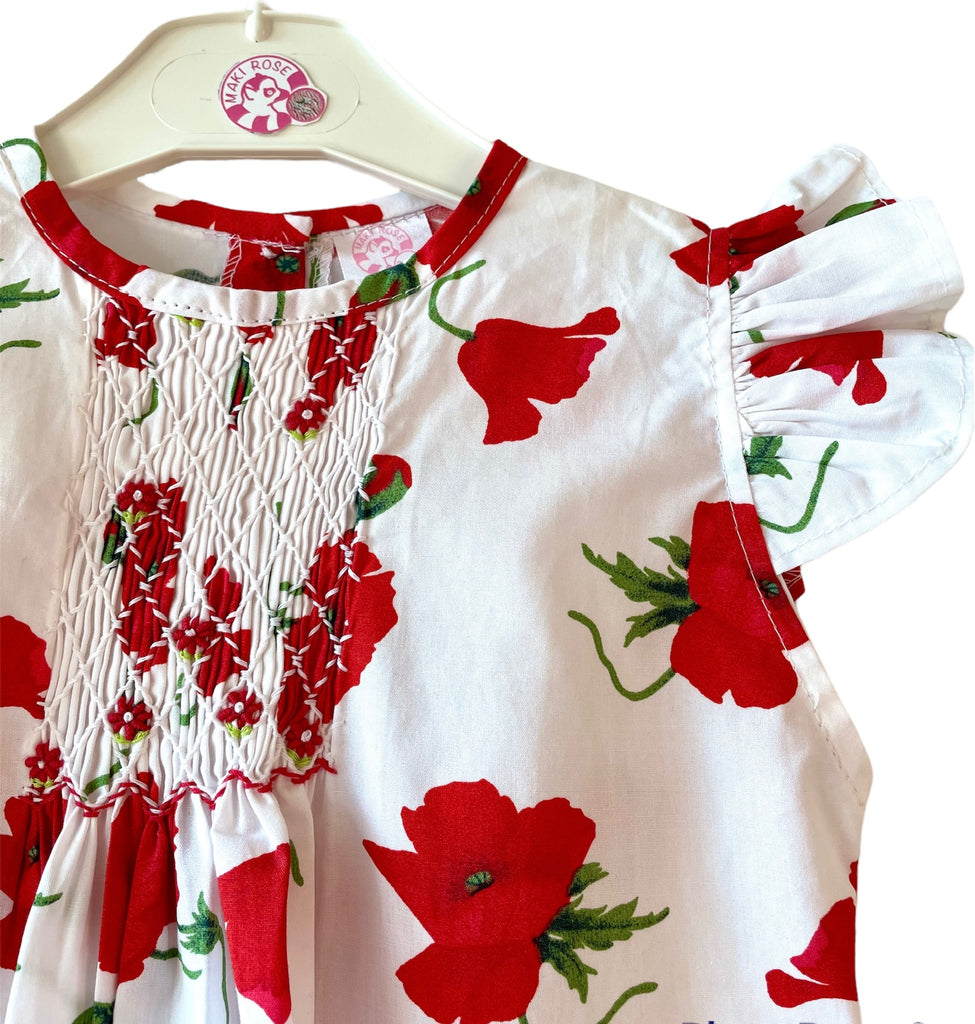 La robe blouse smockée est notre dernière nouveauté, directement inspirée par nos blouses et vos suggestions quant à les décliner en tant que petite robe. Le modèle "Coquelicot" arbore un tissu couvert de grands coquelicots sur fond blanc. Sans manches avec de petits volants aux épaules et un carré smocké et brodé main au niveau du col, cette robe légère tombe au dessus du genou et saura ravir les plus jeunes comme les plus âgées de vos princesses.