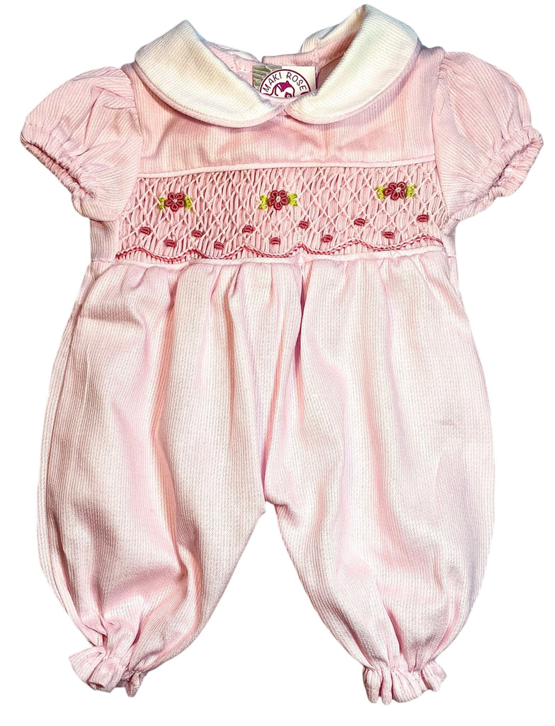Les poupées et poupons ont aussi le droit aux mêmes barboteuses smockées que les enfants ! Que ce soit pour les assortir à la tenue de vos bouts de chou ou pour des poupées de collection, cette adorable barboteuse rose pâle en version miniature hérite de la même qualité que nos barboteuses classiques avec un buste smocké, des broderies à la main, un joli col claudine à liseré et un tissus 100% coton de qualité. Le dos possède une fermeture à scratch pour plus de praticité.