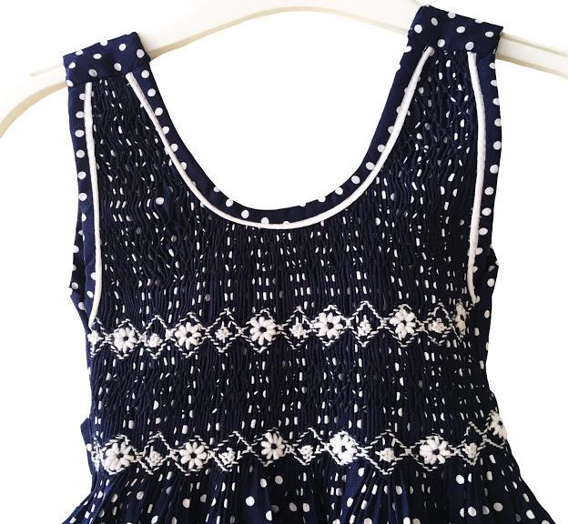 Robe smocks enfant fille bleu marine pois blancs dos ouvert croisillons