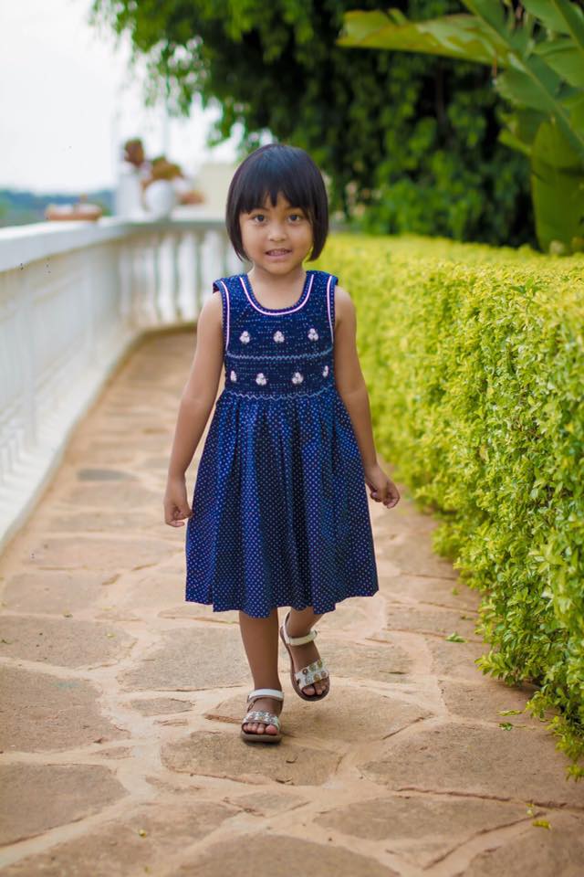 La robe chasuble smockée est un modèle incontournable. Le modèle "Classic" arbore un tissu bleu marine à petits pois blancs. Sans manches avec le buste entièrement smocké et des broderies faites à la main, un ruban à attacher à l'arrière pour cintrer le modèle ainsi qu'un joli dos ajouré, elle tombe juste au dessus du genou et donne cet effet "robe de princesse" lorsque vos pitchounes tournent sur elles-même.