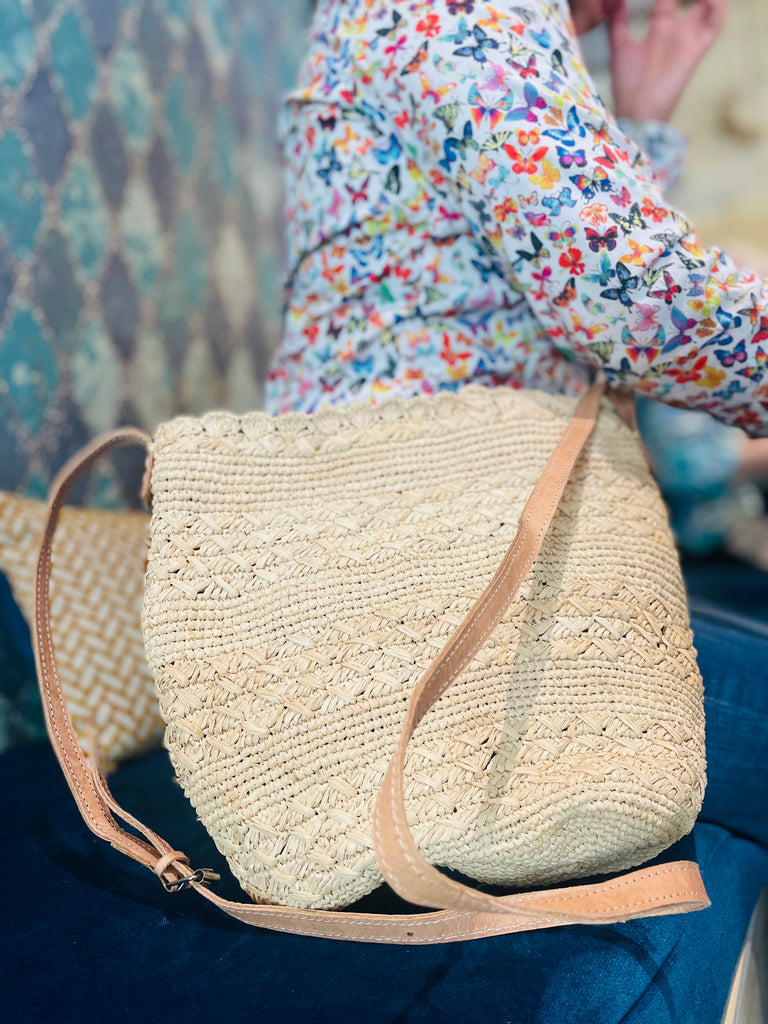 Magnifique sac bandoulière en crochet fait à la main à base de raphia naturel, entièrement doublé avec des anses en cuir et une fermeture éclair. Sa taille permet de transporter l’essentiel de nos affaires, il est pratique que ce soit pour aller à la plage, ou en sortie au marché ou en ville. Il saura sublimer vos tenues car il est d’une élégance naturelle.