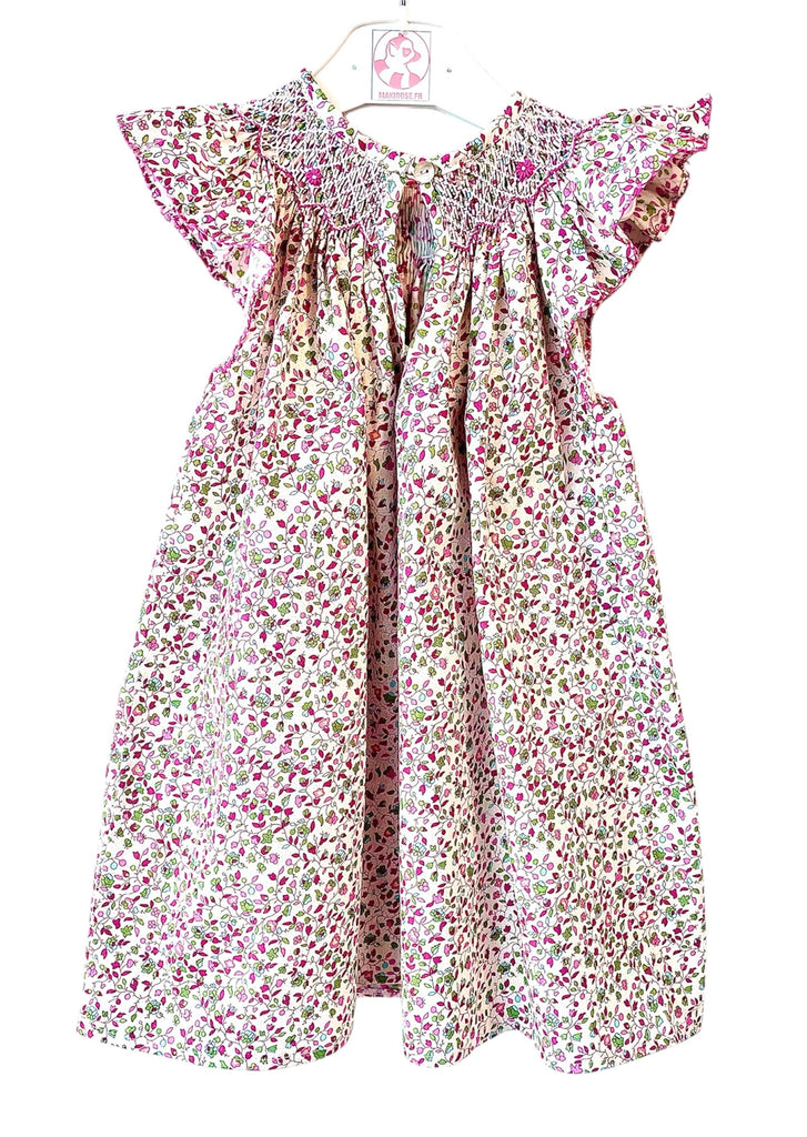 La robe blouse smockée est notre dernière nouveauté, directement inspirée par nos blouses et vos suggestions quant à les décliner en tant que petite robe. Le modèle "Aubergine " arbore un tissu à fleurs dans les tons violet et bordeaux, avec des feuilles vertes. La robe a de jolies manches volantées et le tour du cou entièrement smocké et brodé main , cette robe légère tombe au dessus du genou et saura ravir les plus jeunes comme les plus âgées de vos princesses.