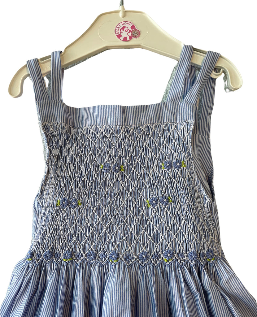 La robe chasuble smockée est un modèle incontournable, ici décliné dans une version moins classique avec des doubles bretelles. Le modèle "Agapanthe" arbore un tissu à fines rayures bleues et blanches. Le buste entièrement smocké et des broderies faites à la main, un ruban à attacher à l'arrière pour cintrer le modèle ainsi qu'un joli dos boutonné, elle tombe juste au dessus du genou et donne cet effet "robe de princesse" lorsque vos pitchounes tournent sur elles-même.