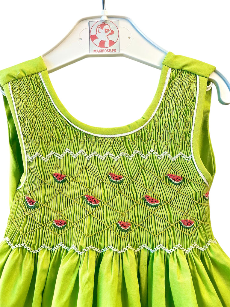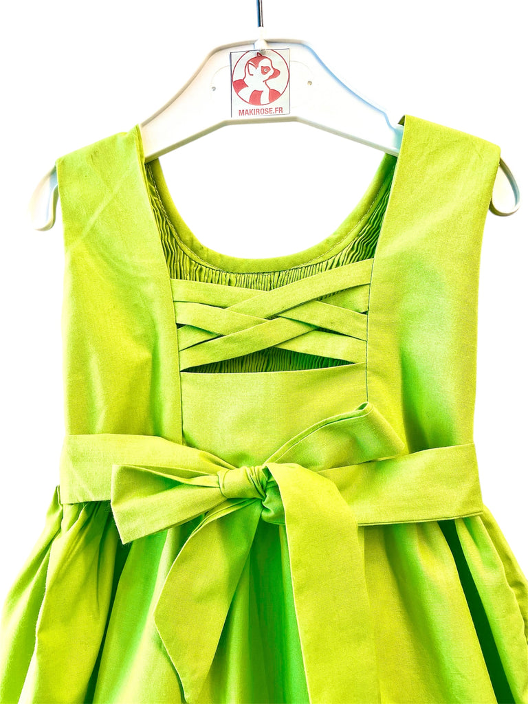 La robe chasuble smockée est un modèle incontournable. Ici, le modèle est de couleur unie vert anis. Sans manches avec le buste entièrement smocké et des broderies faites à la main, un ruban à attacher à l'arrière pour cintrer le modèle ainsi qu’un joli dos croisé, elle tombe juste au dessous du genou et donne cet effet "robe de princesse" lorsque vos pitchounes tournent sur elles-même.