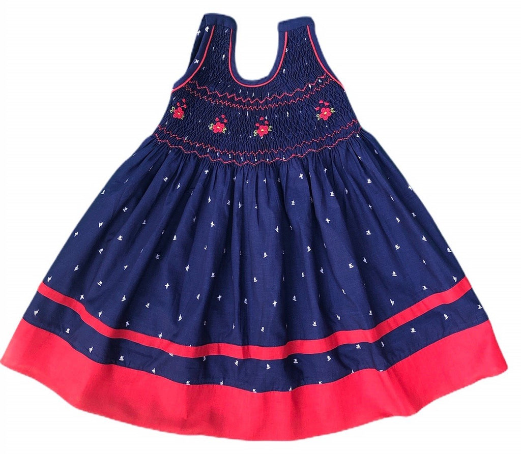 Robe smocks "Ski" Chasuble Bleu Marine à Motifs Blanc et Rouge